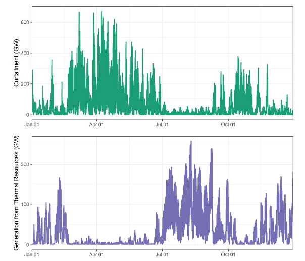 可再生能源和晝間儲能滿足這一需求的能力降低了,因為電力供應(yīng)在一年中的大部分時間已經(jīng)飽和,下圖顯示的削減量就說明了這一點。在一年中的大部分時間里,任何額外的晝間儲能系統(tǒng)都會閑置,從而降低其成本效益。季節(jié)性儲能系統(tǒng)可以提供一種經(jīng)濟(jì)的替代方法,在春季和秋季儲存多余的發(fā)電量,并將其轉(zhuǎn)移到夏季和冬季。