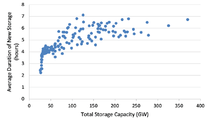 圖14.儲能系統(tǒng)部署的平均持續(xù)時間隨著儲能系統(tǒng)總裝機(jī)容量的增加而增加,最高可達(dá)約200GW。