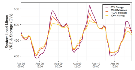 隨著儲能部署的增加,凈峰值負(fù)載期間的持續(xù)時間將會增長,需要更多的儲能容量(更長的持續(xù)時間)來提供電力。圖13顯示了在參考2050年儲能部署情景中,在三天的峰值需求期間中不同儲能系統(tǒng)量的凈需求。它還顯示了在儲能裝機(jī)容量或多或少的情況下的凈需求。儲能系統(tǒng)部署水平的提高會擴(kuò)大峰值期間,從而增加所需的儲能容量,以提供固定容量并繼續(xù)降低凈峰值需求。