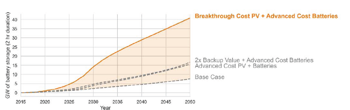 圖12.隨著成本的降低,分布式儲能系統(tǒng)的預(yù)計采用率隨著時間的推移而增加,如果太陽能發(fā)電設(shè)施成本降低,則會顯著增加。