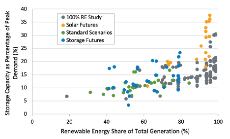圖11. 儲能系統(tǒng)容量作為可再生能源貢獻(xiàn)的函數(shù)(%)。