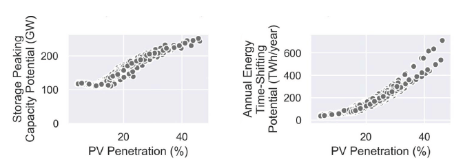 圖10.作為太陽能貢獻(xiàn)函數(shù)曲線的晝間儲能峰值容量潛力(長達(dá)12小時)(左)和作為太陽能發(fā)電貢獻(xiàn)曲線的晝間能量時移潛力(右)。
