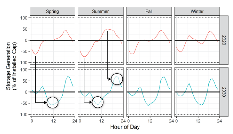 圖9說明了隨著太陽能發(fā)電設(shè)施裝機(jī)容量的增加,儲能系統(tǒng)運(yùn)營如何隨著凈負(fù)載的變化而變化。頂部曲線顯示了2020年模擬條件下的美國晝間儲能平均充放電的概況,其中儲能系統(tǒng)主要在夜間充電,這對應(yīng)于最低的凈負(fù)荷水平。底部面板顯示了2030年模擬條件的結(jié)果,其中部署的太陽能發(fā)電設(shè)施大幅增加。儲能系統(tǒng)充電的時間大部分將轉(zhuǎn)移到中午,這與過剩的太陽能發(fā)電量的可用性相吻合。