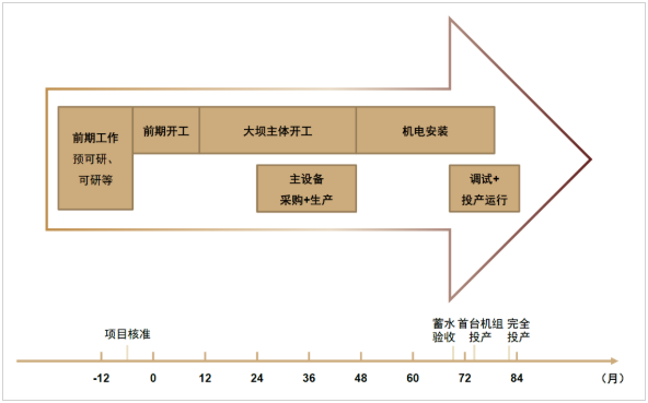 抽水蓄能電站建設(shè)周期大多在7-8年。前期一般需要經(jīng)歷站址選點(diǎn)、項(xiàng)目意向簽約、預(yù)可研及可研編制審查等環(huán)節(jié),項(xiàng)目核準(zhǔn)權(quán)在能源領(lǐng)域“放管服”背景下已由國(guó)家層面轉(zhuǎn)交至地方發(fā)改委。抽水蓄能電站建設(shè)具體時(shí)間線(xiàn)見(jiàn)下圖。