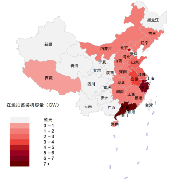 當(dāng)前抽水蓄能裝機(jī)主要集中在我國(guó)東南部 (統(tǒng)計(jì)截至2022年4月)