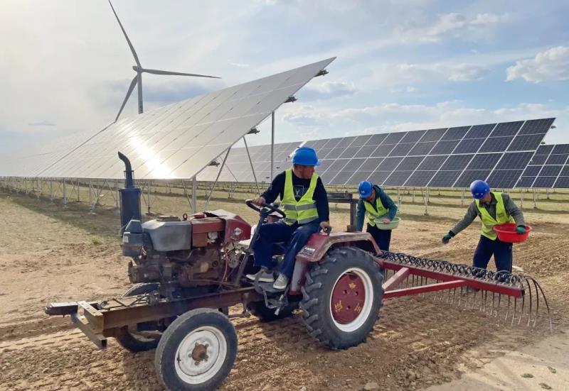 拖拉機(jī)先犁地、松土,作業(yè)人員再撒草籽,灑水車澆水,拖拉機(jī)蓋土,5月的光伏區(qū)一派繁忙的“種草”場(chǎng)面。