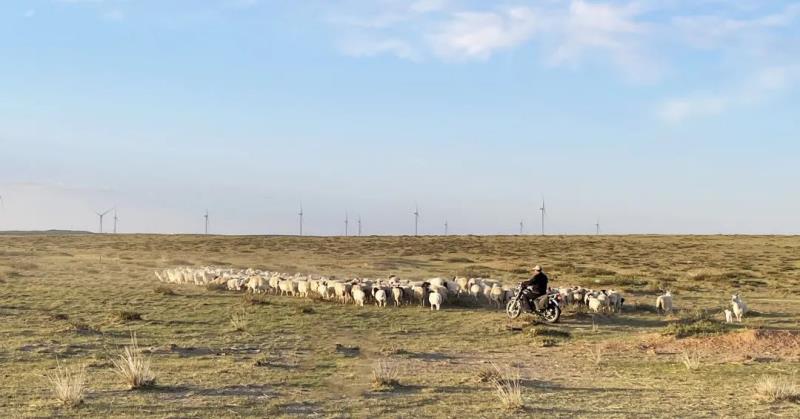 早上5點(diǎn)剛過,天邊的朝陽剛剛露出“半個(gè)頭”,牧民張大爺像往常一樣推開門,將他的干糧袋和水壺放在騎了多年的摩托車上,之后熟練地打開自家羊圈的門,將800多只黑白相間的綿羊趕到草原上。