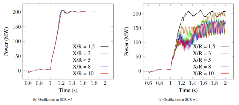 評價電網(wǎng)某個給定點的“強”或“弱”,是指其是否可以在穩(wěn)定狀態(tài)下傳輸電能的同時,保持足夠的電壓和頻率穩(wěn)定性水平的能力,我們在討論這個話題時需考慮給定連接點的系統(tǒng)特性和其連接的發(fā)電系統(tǒng)的大小。 所以通常我們會使用系統(tǒng)短路比 (SCR)、X/R 比和頻率變化率 (RoCoF) 來綜合量化連接點的強度。從一個銷售的視角簡化看這個問題,當SCR≥5視作強電網(wǎng),當SCR<5視作弱電網(wǎng),當SCR<3視作極弱電網(wǎng)。 圖(b)顯示強電網(wǎng)向電網(wǎng)輸送的有功功率遵循參考值并出現(xiàn)一些振蕩,并在不到半秒的時間內(nèi)穩(wěn)定下來,X/R比對強電網(wǎng)中的電力輸送、振蕩或穩(wěn)定時間沒有顯著影響。隨著SCR的降低 X/R比非常低,這意味著電網(wǎng)更具有電阻。X/R比增加會更容易震蕩,導致功率傳輸性能差。