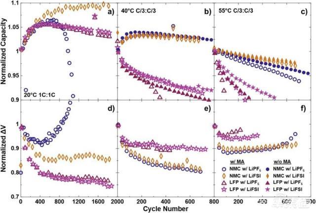 在設(shè)定的所有循環(huán)溫度下,低電壓NMC 532與LFP電池和NMC 532電池相比,電池的容量保持能力更強(qiáng),且工作電壓最高可達(dá)4.2V。
