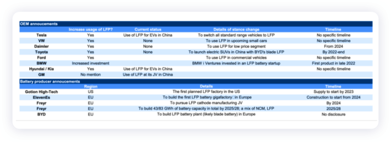 中國(guó)磷酸鐵鋰從2021年9月開始超越三元電池,在中國(guó)以外,磷酸鐵鋰的使用在逐步加快。因?yàn)?2022-23年左右的專利到期取消,這使得中國(guó)以外的使用限制得以打開。鑒于 LFP 的成本優(yōu)勢(shì)和車企的材料多樣化激勵(lì)措施,現(xiàn)在預(yù)計(jì)磷酸鐵鋰的市場(chǎng)份額將上升到 2030年,從25%提高到2030年的38%。由于磷酸鐵鋰的能量密度較低,大量部署的領(lǐng)域主要包含中小型電動(dòng)汽車。