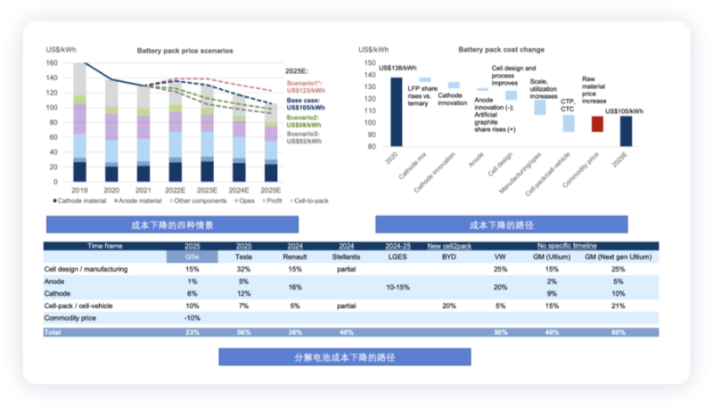 2020-2025年平均電池價(jià)格下降32美元/千瓦時(shí)(從138美元/千瓦時(shí)至105美元/千瓦時(shí)),原材料價(jià)格變化可能有13-45美元/千瓦時(shí)的反彈,電芯成本下降主要來自正極創(chuàng)新和電芯設(shè)計(jì)變化、更好的設(shè)計(jì)(電池到車輛的集成)和產(chǎn)能利用率提高上節(jié)省的運(yùn)營(yíng)成本。汽車制造商將逐步采用更大的電池。