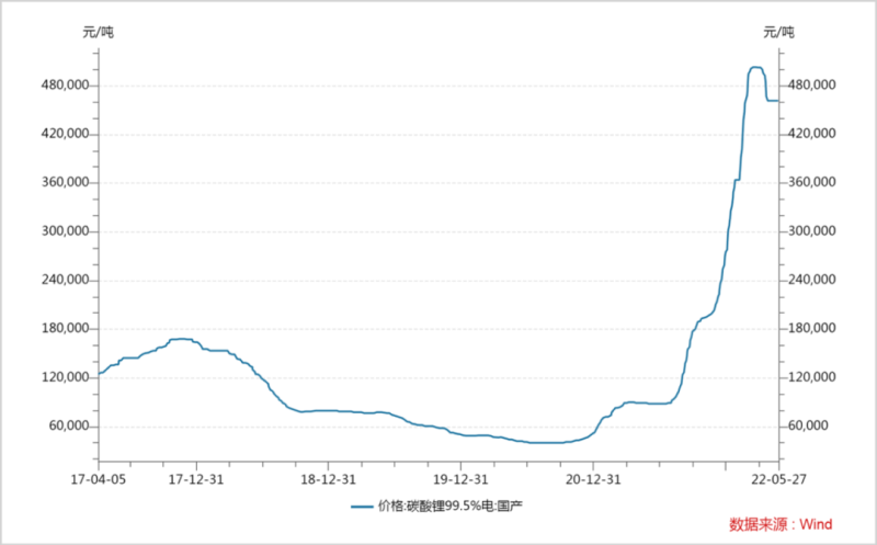 2021年,碳酸鋰漲價幅度高達430%以上。進入2022年,局面進一步失控,碳酸鋰價格從年初的28萬/噸最高漲至超50萬/元噸,在短短三個月的時間里又翻了近乎一倍。