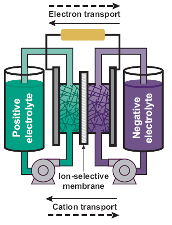 分離反應(yīng)器內(nèi)正負(fù)電解質(zhì)的交換膜具有對(duì)液流電池的技術(shù)和成本產(chǎn)生重大影響。雖然具體要求取決于化學(xué)性質(zhì),但要平衡的典型特性集是電導(dǎo)率、選擇性、穩(wěn)定性和材料成本。對(duì)于液流電池而言,在使用壽命內(nèi)保持性能至關(guān)重要。目前大多數(shù)釩氧化還原液流電池(VRFB)采用離子選擇性膜,根據(jù)分子的電荷分離分子。