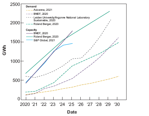 圖2.6 預(yù)計(jì)從2020年到2030年全球鋰離子電池制造能力和需求的增長