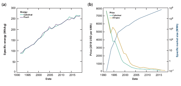 圖 2.5 隨著鋰離子電池市場(chǎng)規(guī)模的擴(kuò)大 (b),比能量 (a) 的歷史增長和價(jià)格的下降