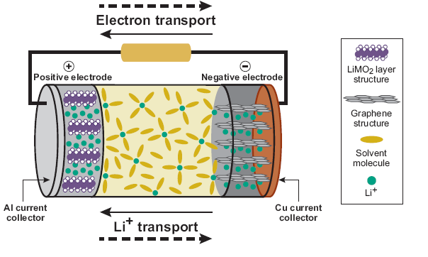 鋰離子電池屬于可充電電池系列,它利用負(fù)極和正極的固體化合物作為可逆鋰離子存儲(chǔ)的主體。在放電過程中,鋰離子從負(fù)極在電池內(nèi)部遷移,通過液體電解質(zhì)嵌入到正極,而電子同時(shí)通過外部電路沿相同方向移動(dòng),為連接電池的設(shè)備供電。在充電過程中,這個(gè)過程是相反的,在外部電源提供的電壓下,鋰離子從正極遷移到負(fù)極,電子流過外部電路。鋰離子電池成為一種相對(duì)成熟的電池技術(shù),得益于三十多年的商業(yè)發(fā)展。這多虧了幾個(gè)因素——包括鋰的原子質(zhì)量較低;能夠在高質(zhì)量和體積濃度下可逆地儲(chǔ)存鋰離子,并且電極電位(電池電壓)差異很大的正極和負(fù)極;以及高電導(dǎo)率電解質(zhì)、支持組件、電池設(shè)計(jì)和制造方法的開發(fā)——如今的鋰離子電池提供的能量和功率密度優(yōu)于大多數(shù)其他種類的電池。最先進(jìn)的鋰離子電池的標(biāo)稱電壓為3.6V~4.0V,其比能量(或稱重量能量密度)在100Wh/kg到250Wh/kg之間,并且能量密度在300Wh/L到650Wh/L之間。它們具有較高的往返能量效率(85%~95%)、較低的維護(hù)要求、足夠的循環(huán)壽命(多達(dá)數(shù)千次完全充放電)以及較低的自放電速率。這些優(yōu)點(diǎn)使鋰離子電池成為廣泛應(yīng)用的主流技術(shù),其應(yīng)用范圍廣泛,其中從便攜式電子產(chǎn)品和電動(dòng)工具到電動(dòng)汽車(EV)和固定式儲(chǔ)能系統(tǒng)。