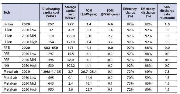 作為此項(xiàng)研究的一部分,麻省理工學(xué)院的研究團(tuán)隊(duì)估計(jì)了鋰離子電池、液流電池和金屬空氣電池在當(dāng)前(2020年)和未來(2050年)的性能和成本指標(biāo),對(duì)未來成本的估計(jì)包括低值、中值和高值。然后將這些成本估算用于以后的電網(wǎng)建模分析。許多研究已經(jīng)探討分析了鋰離子電池的歷史、當(dāng)前和預(yù)計(jì)未來成本。而該研究團(tuán)隊(duì)引用了美國國家可再生能源實(shí)驗(yàn)室(NREL) 2020年年度技術(shù)基線(ATB)調(diào)查報(bào)告中的數(shù)據(jù),這是一個(gè)被廣泛引用的來源,與許多其他已發(fā)表的報(bào)告非常一致。對(duì)于當(dāng)前(2020年)的成本,這份報(bào)告在研究中使用自下而上的成本模型,其中包含電池儲(chǔ)能系統(tǒng)組件的詳細(xì)成本信息,包括鋰離子電池組、逆變器和平衡安裝所需的系統(tǒng)。對(duì)于未來(2050年)的鋰離子電池成本,該報(bào)告根據(jù)對(duì)2018年或2019年發(fā)布的19個(gè)來源的文獻(xiàn)回顧做出預(yù)測(cè)。麻省理工學(xué)院的研究團(tuán)隊(duì)分別使用該文獻(xiàn)綜述中的下限、中值和上限預(yù)測(cè)作為建模分析中的低、中、高成本假設(shè)。一些不太成熟的儲(chǔ)能技術(shù)(即液流電池和金屬空氣電池)的技術(shù)經(jīng)濟(jì)評(píng)估受到組件和系統(tǒng)成本信息來源有限以及工程設(shè)計(jì)和工程設(shè)計(jì)缺乏既定領(lǐng)域標(biāo)準(zhǔn)的挑戰(zhàn)。為了縮小這些差距,研究團(tuán)隊(duì)調(diào)查了已經(jīng)發(fā)表的文獻(xiàn)并聘請(qǐng)了行業(yè)專家。其估計(jì)值與撰寫本文時(shí)(2022年2月)其他已發(fā)布報(bào)告中的估計(jì)值基本一致,并且依賴于基于同行評(píng)審工作的輸入、假設(shè)和計(jì)算。盡管如此,這些值應(yīng)被視為早期估計(jì)值,隨著商業(yè)化的擴(kuò)大和特定化學(xué)品的發(fā)展,未來可能會(huì)對(duì)其進(jìn)行改進(jìn)。