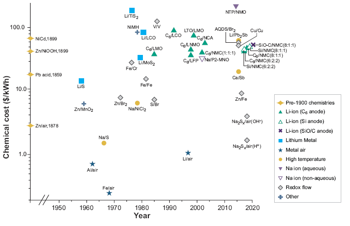 圖2.2 電池電化學(xué)儲(chǔ)能的化學(xué)成本
