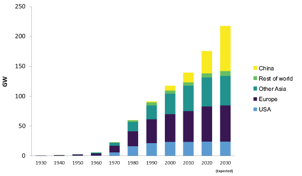 圖3.1世界各地的抽水蓄能設(shè)施裝機(jī)容量的增長(zhǎng)增況
