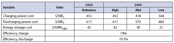 盡管如此,可以開發(fā)出高、中、低成本的估算值,并與報告的數(shù)字進(jìn)行比較。例如,天然氣發(fā)電廠和熱儲能系統(tǒng)的成本信息可用于分別估算CAES系統(tǒng)電力和能源容量的參考成本。由于CAES系統(tǒng)的地上部件(如壓縮機(jī)、膨脹機(jī)和熱交換器)技術(shù)成熟,它們的成本可以給定的工廠進(jìn)行估計(jì)??梢允褂脕碜跃酃馓柲軕?yīng)用的數(shù)據(jù)以一定的準(zhǔn)確度估算低溫和中溫蓄熱的成本。高溫儲存(600℃以上)的成本更不確定。大部分剩余的不確定性CAES成本來自空氣儲能成本的不確定性。