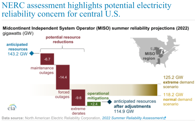 中國儲能網(wǎng)訊:據(jù)美國能源信息署的報告,預(yù)計今年夏天電力需求攀升而潛在的供應(yīng)減少,引發(fā)了對美國今年夏天“中州獨立系統(tǒng)運營商”(MISO)區(qū)域的電力平衡的擔(dān)憂。