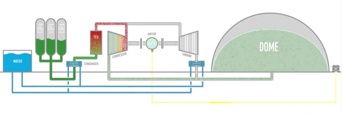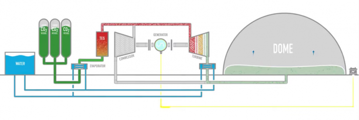 Energy Dome的電池使用巨大的穹頂,其中有巨大的、靈活的囊袋,里面充滿了二氧化碳?xì)怏w。它通過使用能量來運(yùn)行電動壓縮機(jī),將氣體擠壓成越來越小的體積,最終將其冷凝成液體,在環(huán)境溫度下儲存,從而為電池“充電”。這個(gè)充電過程產(chǎn)生廢熱,并被收集到熱能儲存系統(tǒng)中。