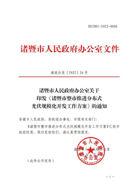 中國儲能網(wǎng)訊:6月10日,浙江省諸暨市人民政府辦公室發(fā)布關(guān)于印發(fā)《諸暨市整市推進分布式光伏規(guī)模化開發(fā)工作方案》的通知。