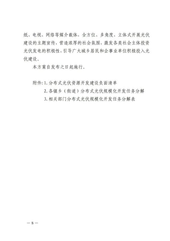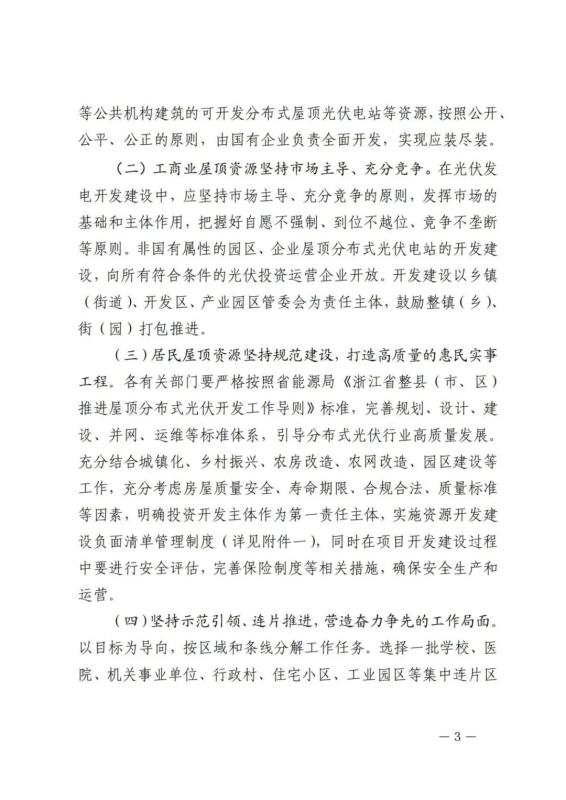 (二)城區(qū)屋頂光伏發(fā)展工程。黨政機關(guān)、車站、學(xué)校、醫(yī)院等公共建筑以及市屬國有企業(yè)可利用的屋頂實現(xiàn)應(yīng)裝盡裝,推動城市連片商品住宅小區(qū)、拆遷安置住宅小區(qū)、商業(yè)建筑建設(shè)屋頂光伏發(fā)電系統(tǒng)。工商業(yè)建筑、特色小鎮(zhèn)、開發(fā)區(qū)(園區(qū))、自來水廠(開放性凈水池除外)、污水處理廠,按國家、省要求積極推進。新建工商業(yè)屋頂、新建民用建筑、新建(改建)大型停車場地等公共基礎(chǔ)設(shè)施統(tǒng)籌規(guī)劃、積極推進。