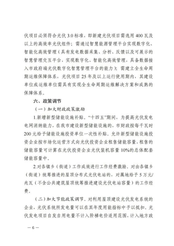 (三)招商引資和產(chǎn)業(yè)平臺光伏發(fā)展工程。新招商引資企業(yè)須100%設(shè)計安裝光伏發(fā)電系統(tǒng),各產(chǎn)業(yè)平臺工業(yè)廠房全面實施屋頂分布式光伏發(fā)電系統(tǒng)開發(fā)(“十四五”期間,存量建筑屋頂安裝比例達到60%以上)。符合條件的年綜合能耗超過1000噸標(biāo)準(zhǔn)煤的企業(yè),原則上要利用屋頂建設(shè)光伏發(fā)電系統(tǒng),進行能耗減量置換。全市新建工業(yè)廠房(含辦公和生活用房),按照同步設(shè)計、同步實施的要求,在建設(shè)用地出讓時,按照“宜建盡建”的原則均必須明確規(guī)劃、建設(shè)屋頂分布式光伏發(fā)電系統(tǒng)。