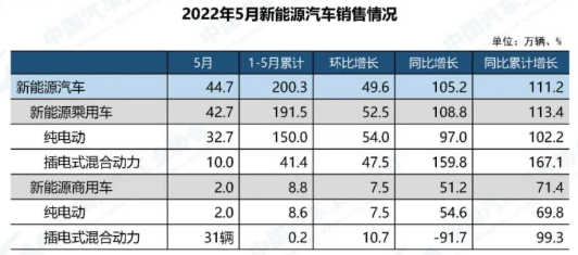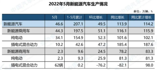 6月10日,中汽協(xié)發(fā)布數(shù)據(jù),2022年1-5月我國(guó)新能源汽車?yán)塾?jì)產(chǎn)量207.1萬(wàn)輛,同比增長(zhǎng)114.2%;銷量200.3萬(wàn)輛,同比增長(zhǎng)111.2%。