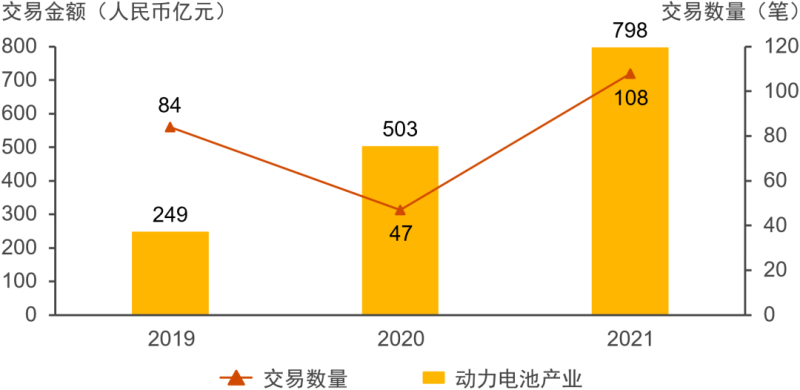2021年動力電池交易金額較過去兩年穩(wěn)中有升,披露金額為人民幣798億元,交易筆數(shù)較去年也有較大提升,達到108筆。相較2020年有爆發(fā)式的增長,交易金額約占能源行業(yè)整體交易的20%,相較于2020年18.7%的交易占比,穩(wěn)中有升。