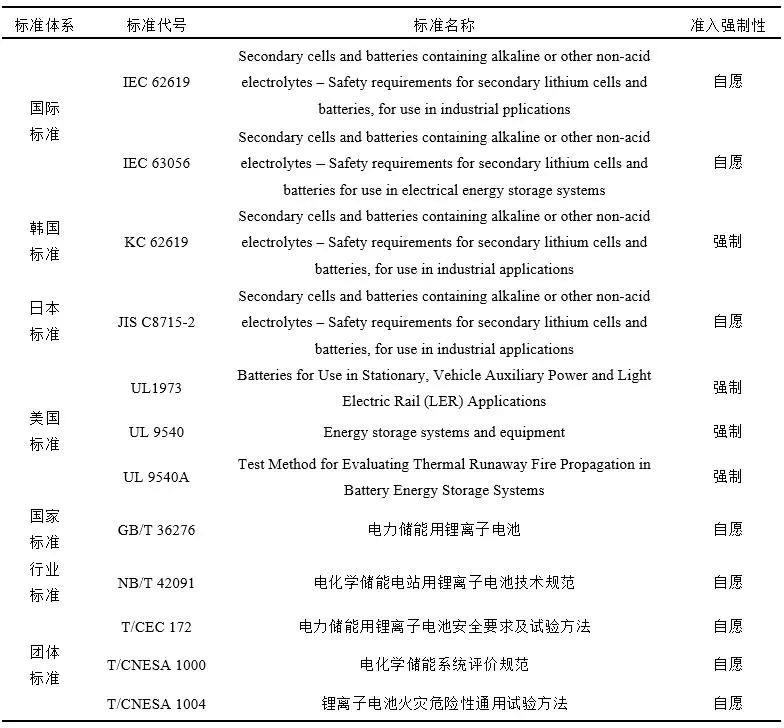 表1 國(guó)內(nèi)外常用儲(chǔ)能鋰離子電池安全性測(cè)試標(biāo)準(zhǔn)
