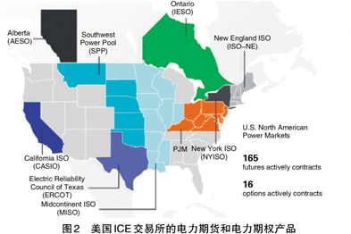 由于電力網(wǎng)絡(luò)及系統(tǒng)特有的復(fù)雜性,各個物理節(jié)點間供需不平衡導(dǎo)致整個網(wǎng)絡(luò)中電力價格存在差異,難以形成統(tǒng)一的電力價格而不利于電力期貨市場的發(fā)展。為解決此問題,美國PJM電力市場在所管轄的電網(wǎng)建立了若干交易中心節(jié)點,對應(yīng)相關(guān)多個實際物理節(jié)點。該中心節(jié)點的電價是這些節(jié)點邊際電價(Locational Marginal Price,LMP)的加權(quán)平均,即中心節(jié)點的LMP是PJM電力市場的電價指數(shù),基于中心節(jié)點的LMP可開發(fā)出各類電力金融衍生品。如圖2所示,在美國洲際交易所(Intercontinental Exchange,ICE)可以購買到美國7大區(qū)域電力市場的165種電力期貨產(chǎn)品和15種電力期權(quán)產(chǎn)品。