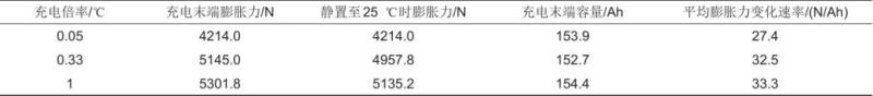 表3 動力電池在25 ℃、0.05 C、0.33 C、1 C倍率充電時膨脹力數(shù)據(jù)表