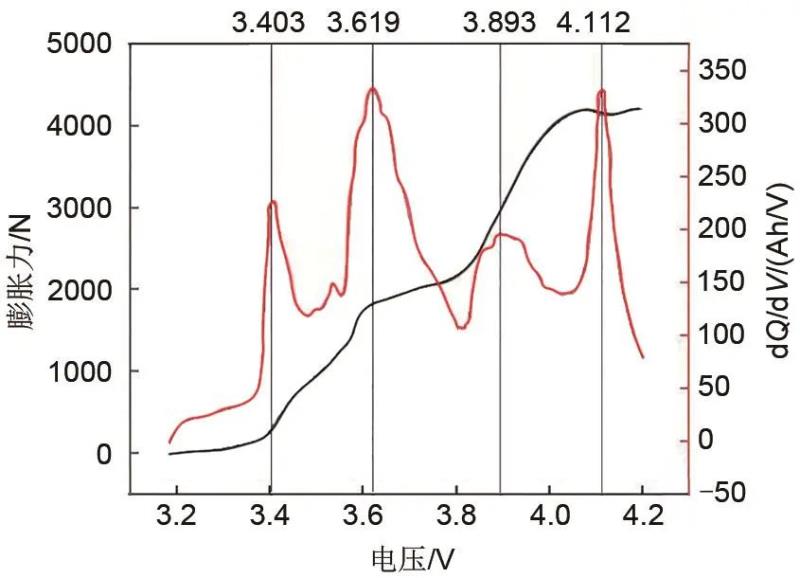 對動力電池充電過程中的dQ/dV曲線進行分析發(fā)現(xiàn)其四個波峰分別對應(yīng)膨脹力增加的四個階段,dQ/dV曲線的波峰反映了正負(fù)極材料的相變,不同的相變使得正負(fù)極材料厚度發(fā)生不同的變化。前期膨脹力的快速變化主要是由于石墨負(fù)極在不同充電深度時的相變,而在末期的緩慢波動則與正極材料的收縮和石墨負(fù)極排列狀態(tài)的變化密切相關(guān)。