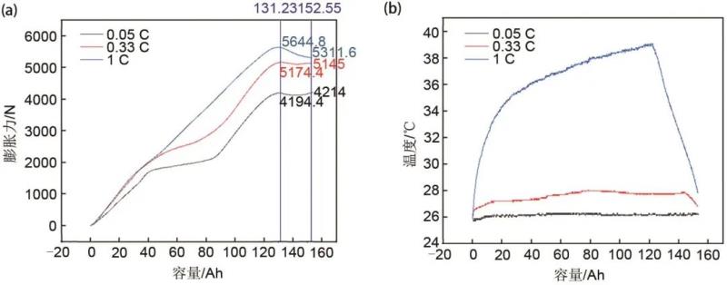圖3 動力電池在25 ℃、0.05 C、0.33 C、1 C倍率充電時(a) 充電容量和膨脹力曲線;(b) 溫度變化曲線
