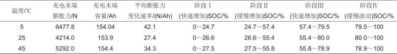 為了量化膨脹力變化趨勢的四個階段,將充電末端膨脹力和容量的比值作為平均膨脹力變化速率,膨脹力和容量的微分作為膨脹力變化速率,電池充電末端的容量作為電池SOC狀態(tài)計算的基準(zhǔn)值。由此可以認(rèn)為當(dāng)膨脹力變化速率高于平均膨脹力變化速率時,膨脹力處于快速增長狀態(tài);當(dāng)膨脹力變化速率低于平均膨脹力變化速率時,膨脹力處于緩慢增長狀態(tài);當(dāng)膨脹力變化速率低于零時,膨脹力處于下降狀態(tài)?;谝陨蠀?shù)和狀態(tài)定義,定量表征膨脹力變化狀態(tài)與SOC的關(guān)系,其結(jié)果如表2所示。根據(jù)SOC大致可分為四個階段:0~26% SOC為快速增長階段,26%~56% SOC為緩慢增長階段,56%~80% SOC為快速增長階段,80%~100% SOC為緩慢波動階段。由于不同溫度下充電過程中膨脹力四個增長階段對應(yīng)的SOC范圍接近程度高,SOC差異在3%以內(nèi),表明此階段的分布具有可靠性。