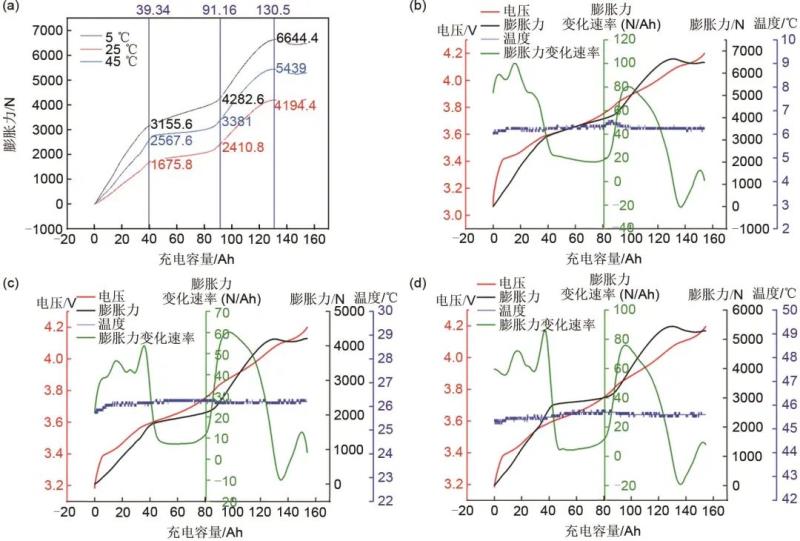 圖2 動力電池膨脹力變化特性:(a) 動力電池在0.05 C、不同溫度下充電容量和膨脹力曲線;(b) 動力電池在5 ℃、0.05 C下電壓、溫度、膨脹力、膨脹力變化速率隨充電容量的變化圖;(c) 動力電池在25 ℃、0.05 C下電壓、溫度、膨脹力、膨脹力變化速率隨充電容量的變化圖;(d) 動力電池在45 ℃、0.05 C下電壓、溫度、膨脹力、膨脹力變化速率隨充電容量的變化圖