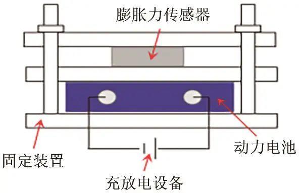 圖1為動力電池膨脹力測試裝置,通過使用固定裝置將測試電池和力傳感器固定,并將電池和充放電設(shè)備相連。由于電池的膨脹并不均勻,在電池和力傳感器之間放置一塊可以上下自由移動的鐵板來將膨脹力均勻分布,并進行實時測量。測試裝置連接完畢后,將其置于溫度箱內(nèi)。