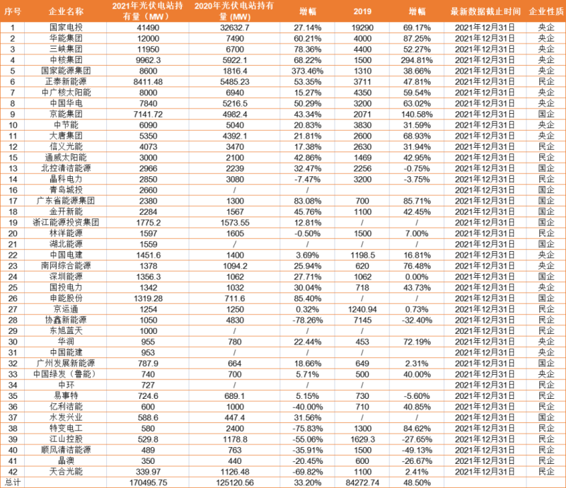 中國儲能網(wǎng)訊:伴隨雙碳目標的深入推進,光伏電站裝機進入快速增長階段,截至2021年底,我國風電、光伏累計裝機分別達到328GW、306GW,在規(guī)模迅速攀升的同時,新能源投資格局愈發(fā)集中。光伏們統(tǒng)計了截至2021年年底42家主流光伏電站投資商的持有裝機規(guī)模,總規(guī)模達到了170GW,全國占比超55%。其中,央國企電站持有量達143GW,占比84.1%,民營企業(yè)僅持有27.5GW,占比16.4%。