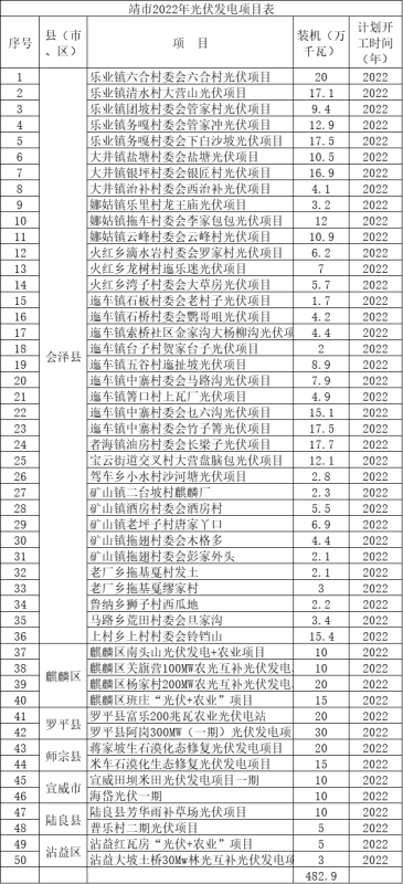根據(jù)文件顯示,曲靖市2022年光伏發(fā)電項目合計50個光伏項目,總裝機482.9萬千瓦,其中會澤縣36個299.9 萬千瓦、麒麟?yún)^(qū)4個55萬千瓦、羅平縣2個50萬千瓦、師宗縣2個35萬千瓦、宣威市2個20萬千瓦、陸良縣2個15萬千瓦、沾益區(qū)2個8萬千瓦。