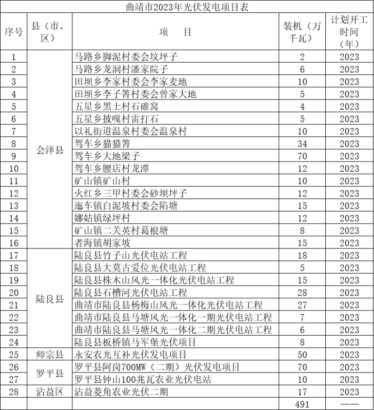 曲靖市2023年光伏發(fā)電項目合計28個光伏項目,總裝機491萬千瓦,其中會澤縣16個230萬千瓦、陸良縣8個114萬千瓦、師宗縣1個50萬千瓦、羅平縣2個80萬千瓦、沾益區(qū)1個17萬千瓦。
