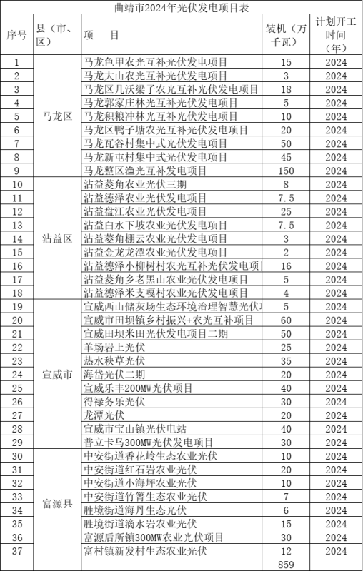 曲靖市2024年光伏發(fā)電項目合計光伏項目37個,總裝機859萬千瓦,其中馬龍區(qū)9個316萬千瓦、沾益區(qū)9個78萬千瓦、宣威市11個355萬千瓦、富源縣8個110萬千瓦(三年項目具體名單看附件)。