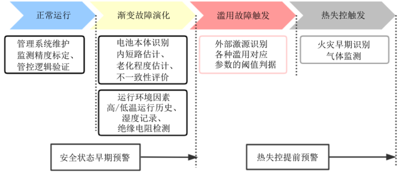 結(jié)合韓國(guó)儲(chǔ)能電站事故分析,電池本體因素及運(yùn)行環(huán)境因素逐漸演化是引起儲(chǔ)能電站事故的根本誘因。鑒于該類(lèi)因素的長(zhǎng)周期演化特性,我們將鋰電池儲(chǔ)能系統(tǒng)安全性評(píng)估劃分為兩個(gè)層次。一是安全狀態(tài)早期預(yù)警,二是熱失控的提前預(yù)警,如圖4所示。