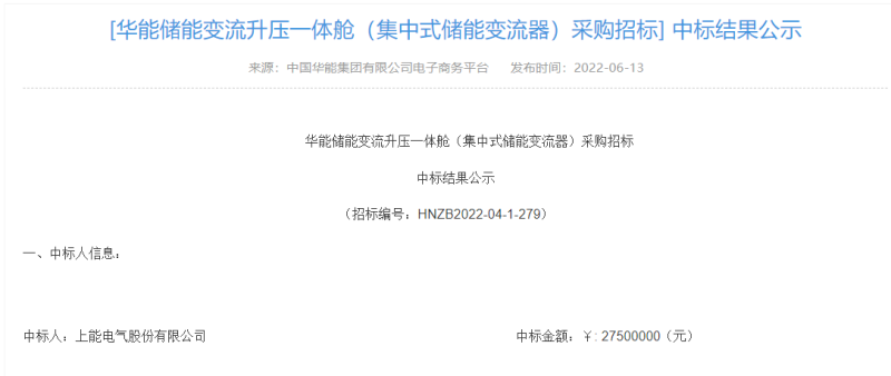 中國儲能網(wǎng)訊:據(jù)了解,6月13日,中國華能集團有限公司電子商務(wù)平臺發(fā)布華能儲能變流升壓一體艙(集中式儲能變流器)采購中標結(jié)果公示。公告中顯示,中標人為上能電氣股份有限公司,中標金額為2750萬元。
