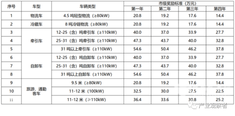 以北京大興為例,一輛31噸以上的牽引車第一年國家補貼54.6萬元,北京市按1:1補54.6萬元,大興按照1:0.4補貼21.84萬元,也就是131.04萬元;第二年國家補貼基數(shù)為50.4萬元,三級累計購車補貼金額為120.96萬元;第三年補貼基數(shù)為46.4萬元,三級累計購車補貼為111.36萬元;第四年補貼基數(shù)為37.8萬元,三級累計購車補貼90.72萬元。