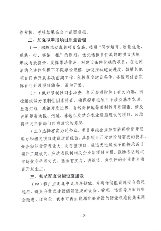 根據(jù)《通知》,加強(qiáng)擬申報(bào)項(xiàng)目質(zhì)量管理。對(duì)建設(shè)條件優(yōu)越的項(xiàng)目,在電網(wǎng)消納允許的前提下不限建設(shè)規(guī)模,加快推動(dòng)建設(shè)進(jìn)度。同時(shí)規(guī)范項(xiàng)目的配套儲(chǔ)能設(shè)施建設(shè),推廣應(yīng)用集中式共享儲(chǔ)能。