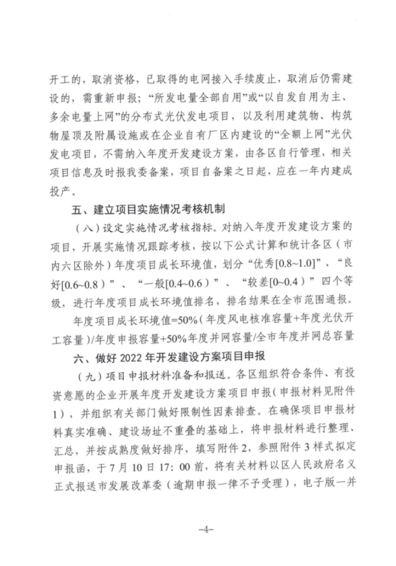 對(duì)納入年度開(kāi)發(fā)建設(shè)方案的項(xiàng)目,開(kāi)展實(shí)施情況跟蹤考核??己斯綖椋耗甓软?xiàng)目成長(zhǎng)環(huán)境值=50%(年度風(fēng)電核準(zhǔn)容量+年度光伏開(kāi)工容量)/年度申報(bào)容量+50%年度并網(wǎng)容量/全市年度并網(wǎng)總?cè)萘?