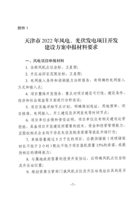 根據(jù)此前2021年6月7日,天津市發(fā)布的《關(guān)于做好我市2021-2022年風(fēng)電、光伏發(fā)電項(xiàng)目開(kāi)發(fā)建設(shè)和2021年保障性并網(wǎng)有關(guān)事項(xiàng)》的文件中,風(fēng)電項(xiàng)目不低于15%,(連續(xù)儲(chǔ)能時(shí)長(zhǎng)不低于1小時(shí),下同)光伏發(fā)電項(xiàng)目承諾儲(chǔ)能配比不低于項(xiàng)目裝機(jī)容量的10%。