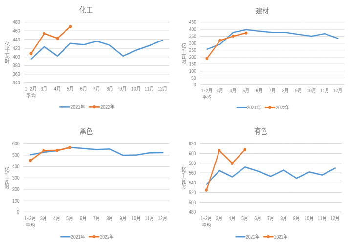 1-5月,化工行業(yè)用電量2229億千瓦時,同比增長5.0%;建材行業(yè)用電量1524億千瓦時,同比下降4.2%;黑色金屬冶煉行業(yè)用電量2615億千瓦時,同比下降2.5%;有色金屬冶煉行業(yè)用電量2910億千瓦時,同比增長1.8%。